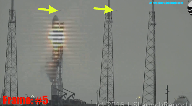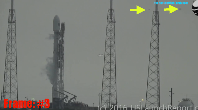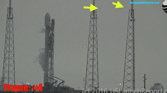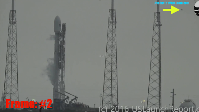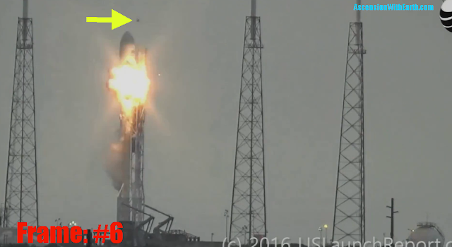 Notes: First frame which we see that the Space X Rocket is in the process of exploding. UFO seems to appear slightly off center to the right of the rocket nose cone. Other UFO is seen between the first two towers.